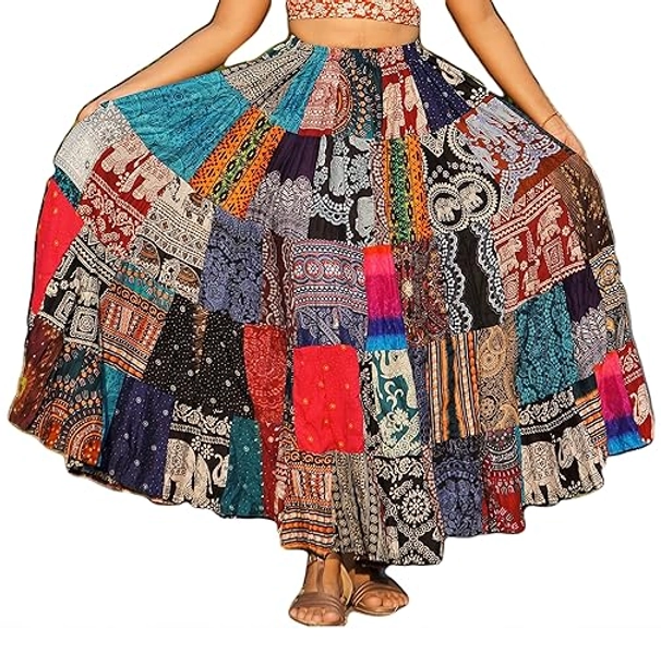 ThaiOnline4u Patchwork Skirt Long Boho Colorful Unique Gypsy Tiered Maxi Full Flared Rayon, Multicoloured, Large