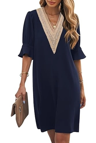 Wkior Shift Dress for Women V Neck Short Sleeves Solid Color Casual Flowy Summer Dresses(S-2XL) - Large - C0-navy Blue