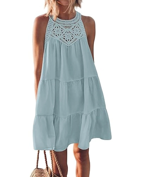 BTFBM Women's Summer Hollow Out Halter Dresses Casual Sleeveless A-Line Tiered Swing Sundress Beach Vacation Mini Dress - Small - Solid Mint Green