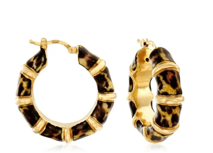 Italian Leopard-Print Enamel Bamboo-Style Hoop Earrings in 18kt Gold Over Sterling