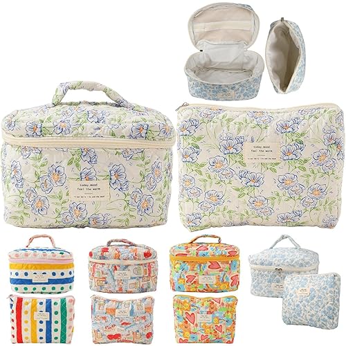 Fcteap Makeup Bag Travel Essentials Quilted Cosmetic Toiletry Pouch Organizer Insert for Women Dorm Room Essential Gift Large Capacity Opening Lightweight Cute Aesthetic Portable 2PCS (Flower) - Flower