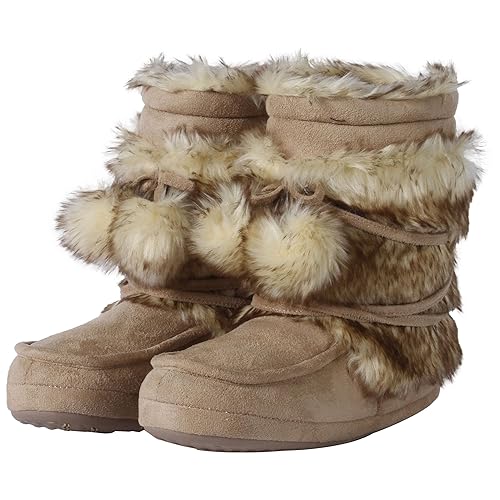 Amzhom Fluffy Slippers for Women Cute Warm Indoor Bootie Slippers with Pompoms Non-slip House Home Boots - Beige - 5-6