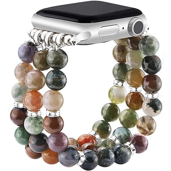 JR.DM Natural Stone Beaded-Bands Compatible with Apple Watch Series 10 9 8 7 6 5 4 3 2 1, Fashion Stretchy Handmade Bracelet Feminine Fancy Boho Elastic Strap for iWatch 38/40/41/42mm Women Gift - Indian Agate - 41/40/38/42mm(Series 10)