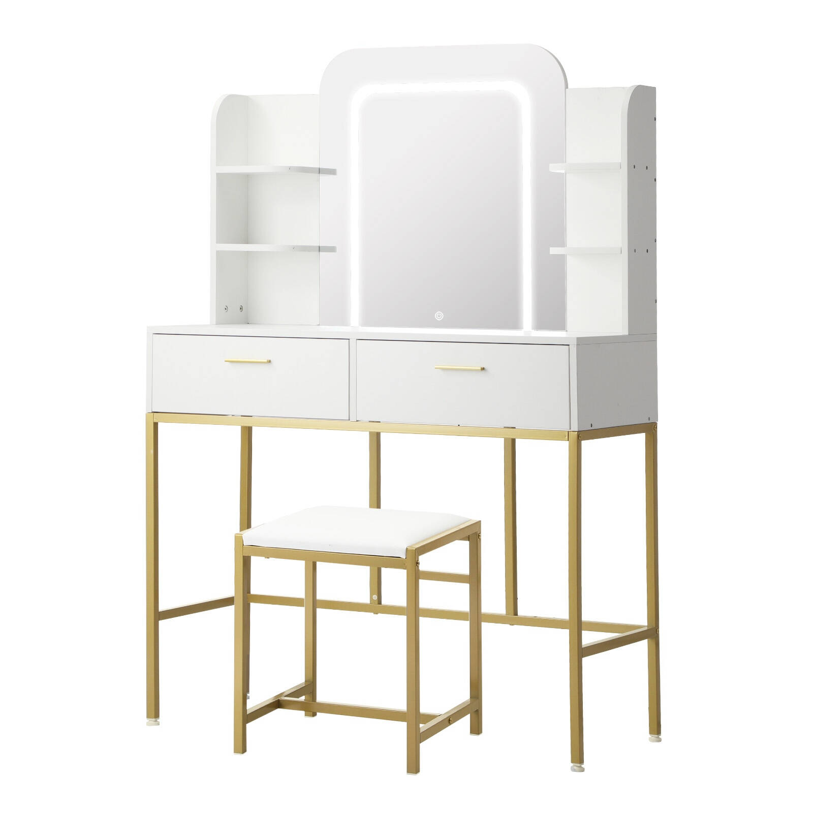 Oikiture Dressing Table Stool Set Makeup LED Mirror Vanity Iron Desk White Gold