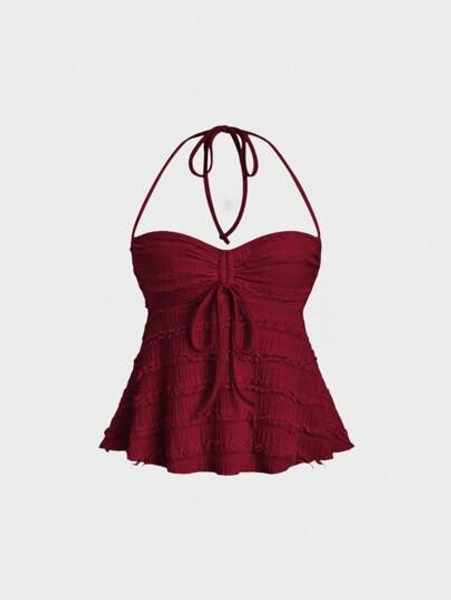 Sweetra Women's Solid Color Front Middle Drawstring Racerback Halter Tank Top