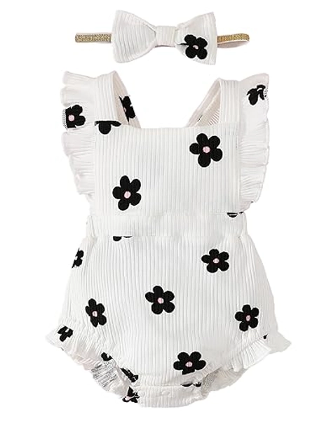 ZAXARRA Little Baby Girls 2Pcs Summer Outfits Fly Sleeve Flower Print Bodysuit with Headband Newborn Clothes - Multicolor - 6-12 Months