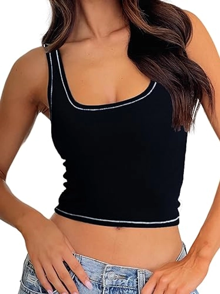 Danysu Women Rib Tank Top Padded Workout Top Square Neck Crop Tank Fitted Basic Cami Tops - Black - X-Small