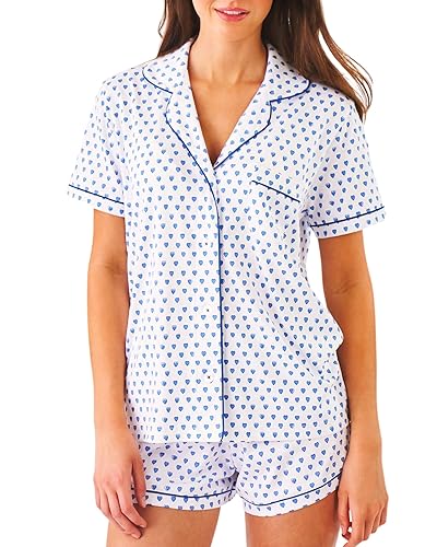 Zelbuck Womens Pajamas Set, 2PCS Button Down Vacation Monkey Beach Shorts Set Y2k Loungewear Pjs for Birthday Valentines Gift - Blue Heart - Small