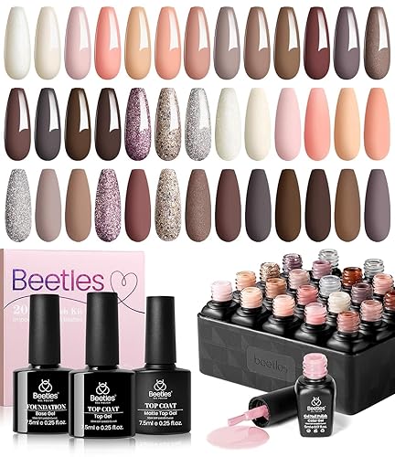 Beetles Gel Nail Polish Set, 23 Pcs Nude Pink Gel Polish Set Glitter Peach Desert Neutral Rose Gel Nail Kit Natural Skin Tone Uv Soak Off Nail Art Glossy & Matte Top Coat Gel Fall Gift for Girls - 1-20 Colors Nude Glitter Brown