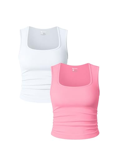 OQQ Womens 2 Piece Crop Tops Rueched Sleeveless Square Neck Stretch Basic Tank Shirts - Small - White,candypink