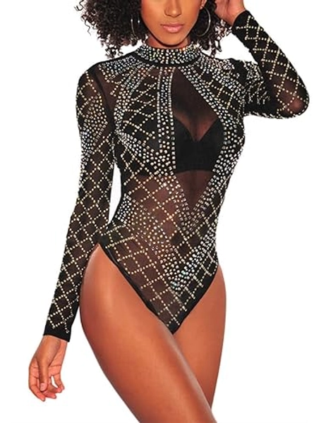 Lrady Women's Sheer Mesh Turtleneck Neck See Through Leotard Bodysuit Body Tops - Medium - Black-7