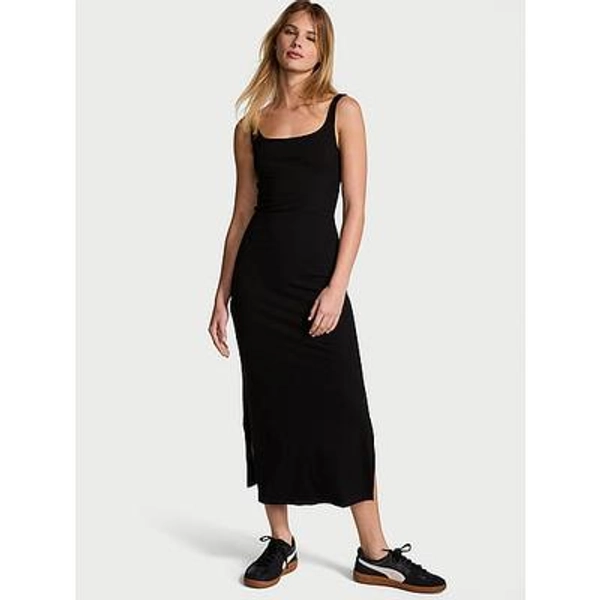 All-Day Soft Ribbed Bodycon Midi Dress, Black, S - Women's Dresses - PINK