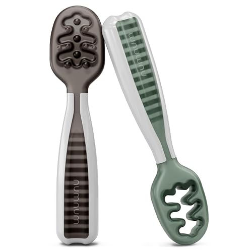 NumNum Baby Spoons Set, Baby Essentials Pre-Spoon GOOtensils for 6+ Months, First Stage Self-Feeding Spoons for Baby Led Weaning (BLW), Silicone Toddler Utensils, BPA-Free, 2 Pack Gray/Green - 6-12 months Gray/Green - 2 Spoons