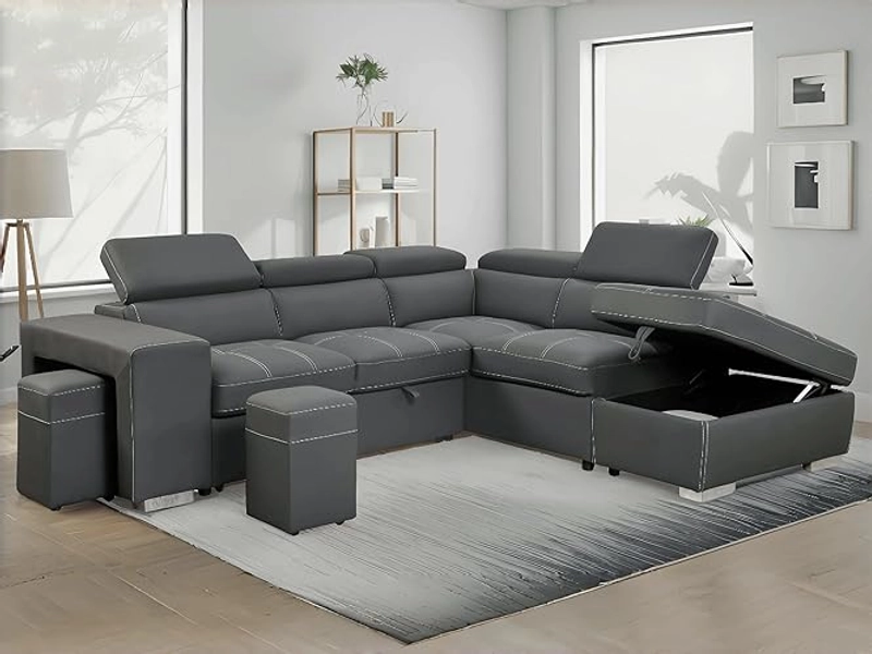 THSUPER 104'' Microfiber Sectional Sleeper Sofa with Pull-Out Bed, Sofa with Chaise & Storage Ottoman. 5 Seater L-Shaped Couch with Adjustable Headrest and Stools. Charcoal Grey